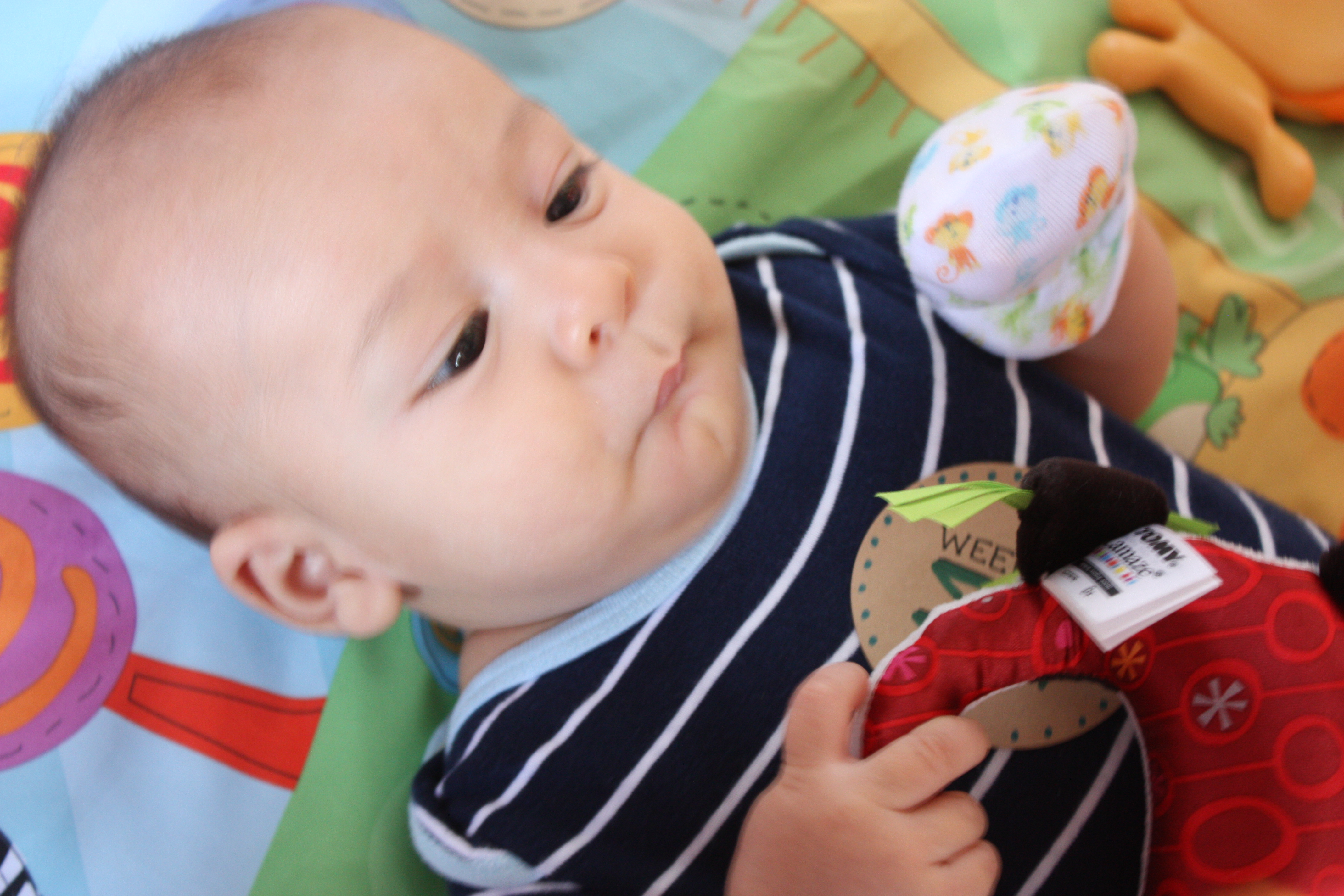 Sep 4 (11 wks) – … and is still happily grabbing on to his panda rattle!