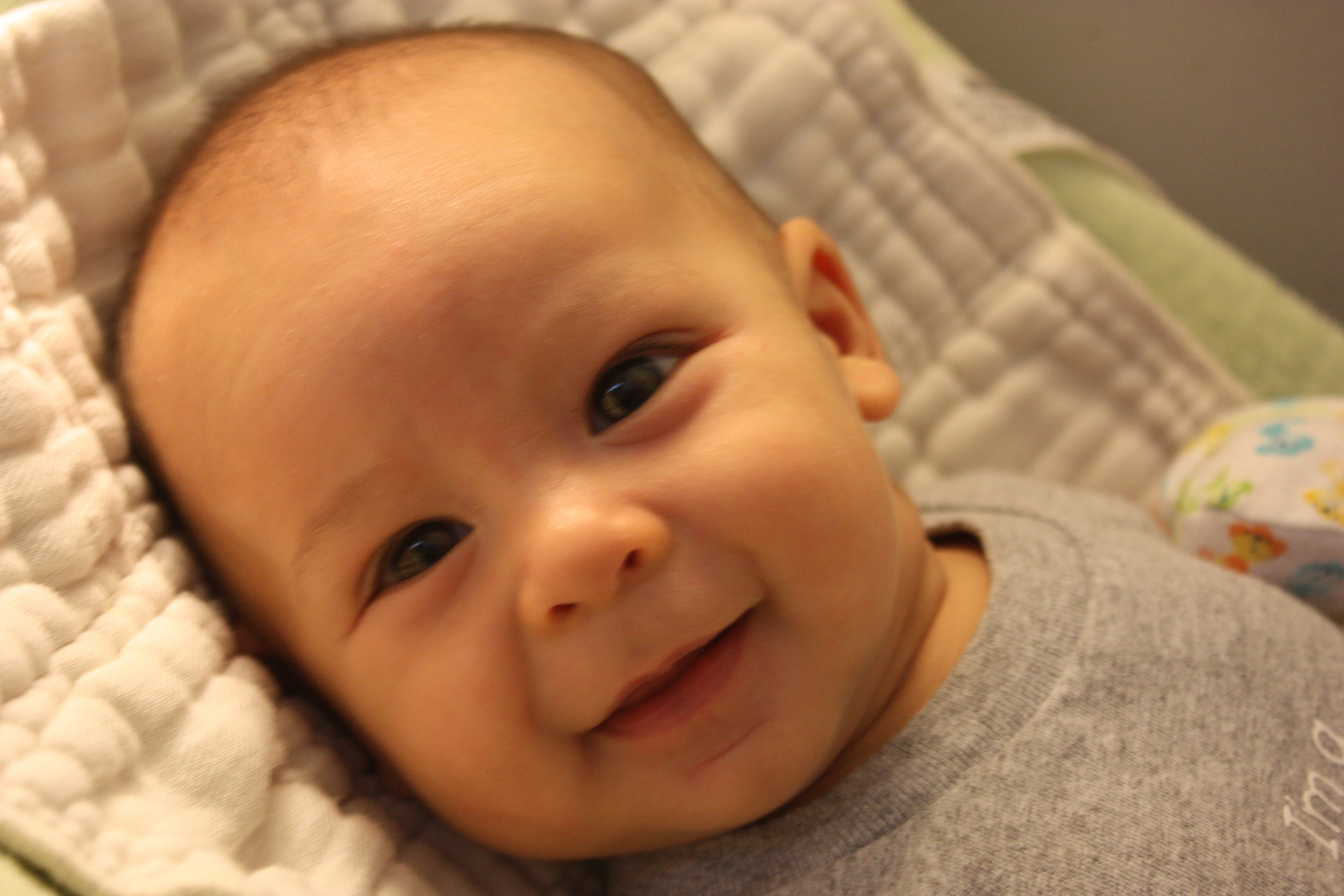 Sep 4 (11 wks) – He started raising his little chin up in the air and giggling (night of Sept 3). During this diaper-changing session, he was giggling so much that I had to grab a camera (an actual one, not the phone)!