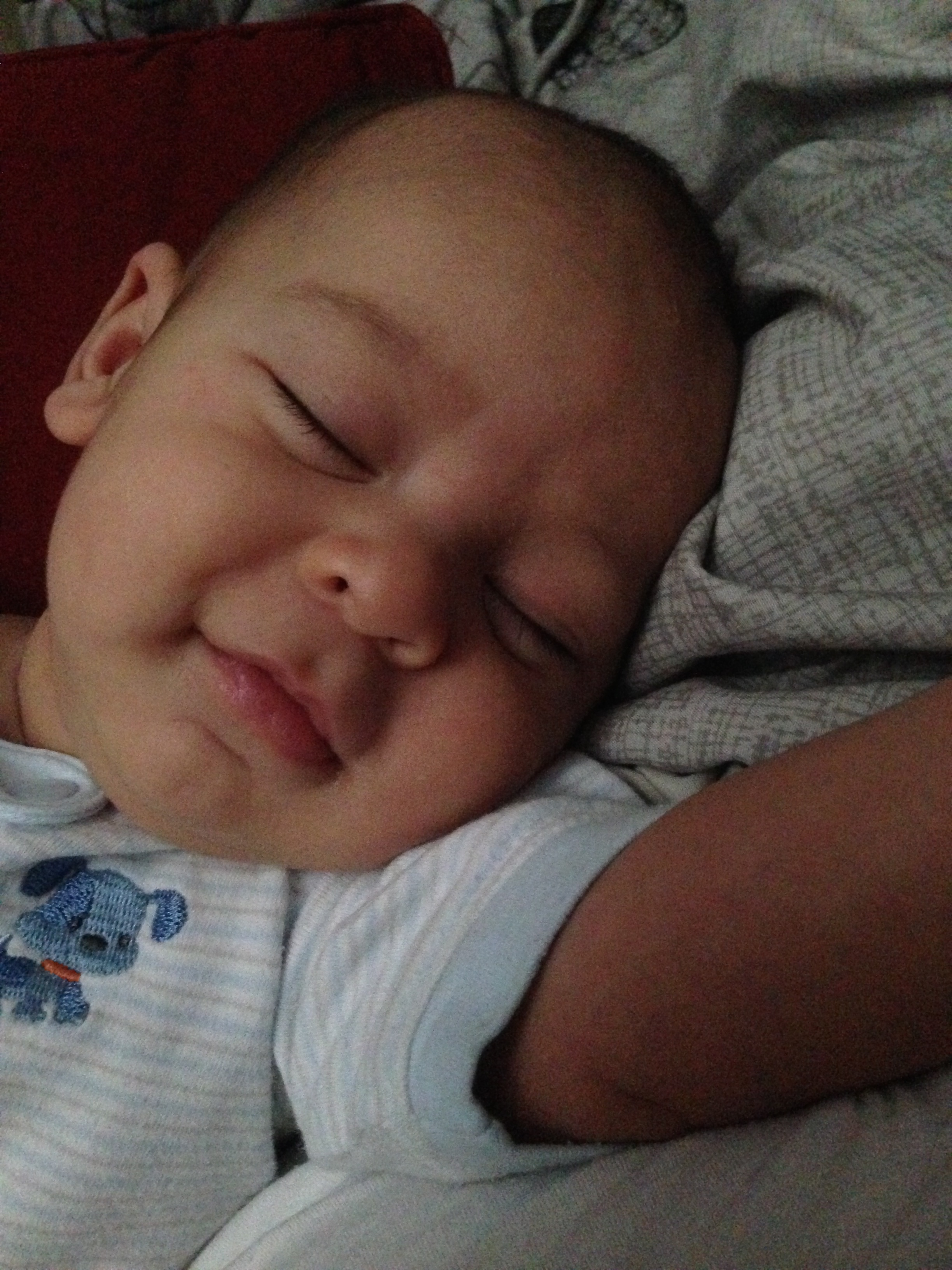 Sep 5 (11 w 1 d) – Ben’s chin is very evident in this picture, though I don’t think he smiles as much as Eli in his sleep. 🙂