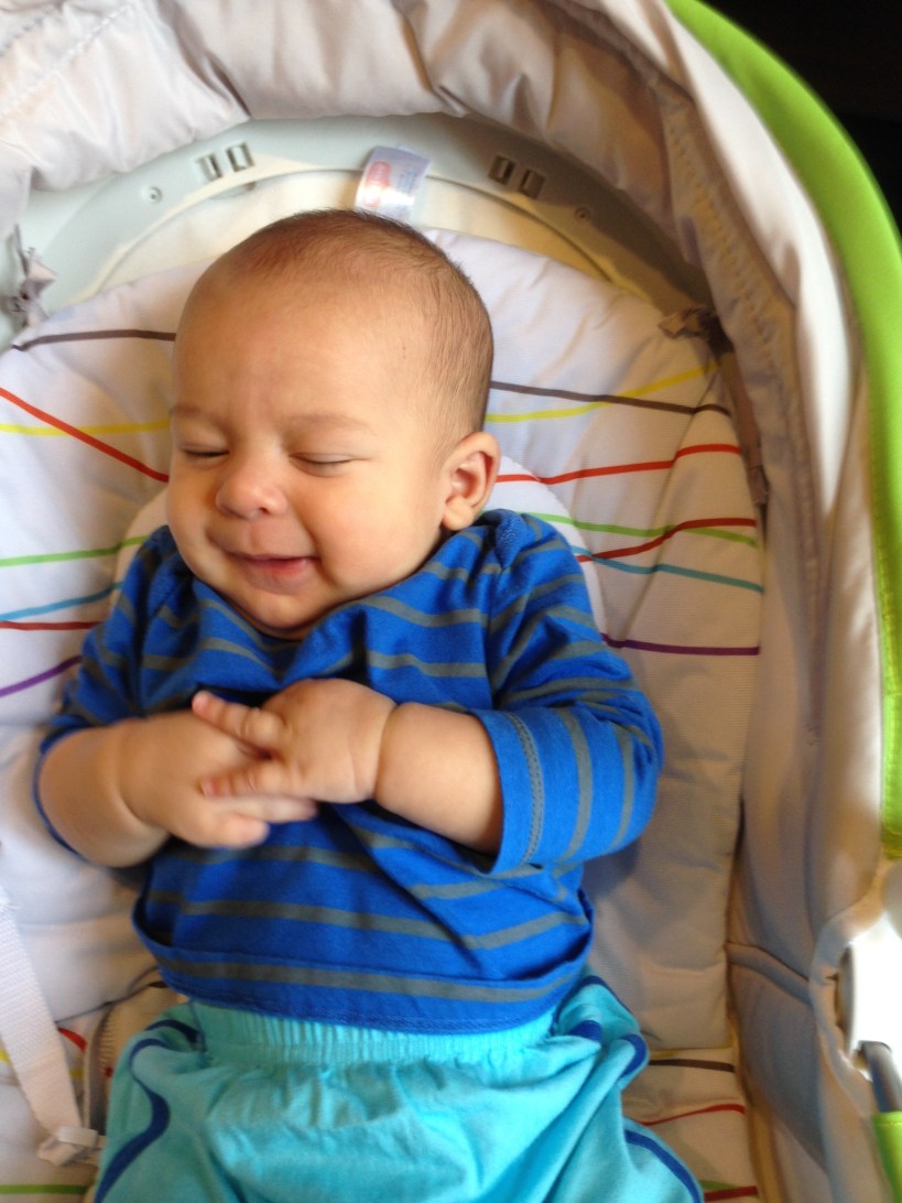 Sep 9 (11 w 5 d) – You can’t see, but Eli is wearing Muay Thai shorts that my sister (Auntie Kit) bought for him. So cute that he can’t resist cackling, it seems! This is my phone wallpaper. It makes me laugh!!