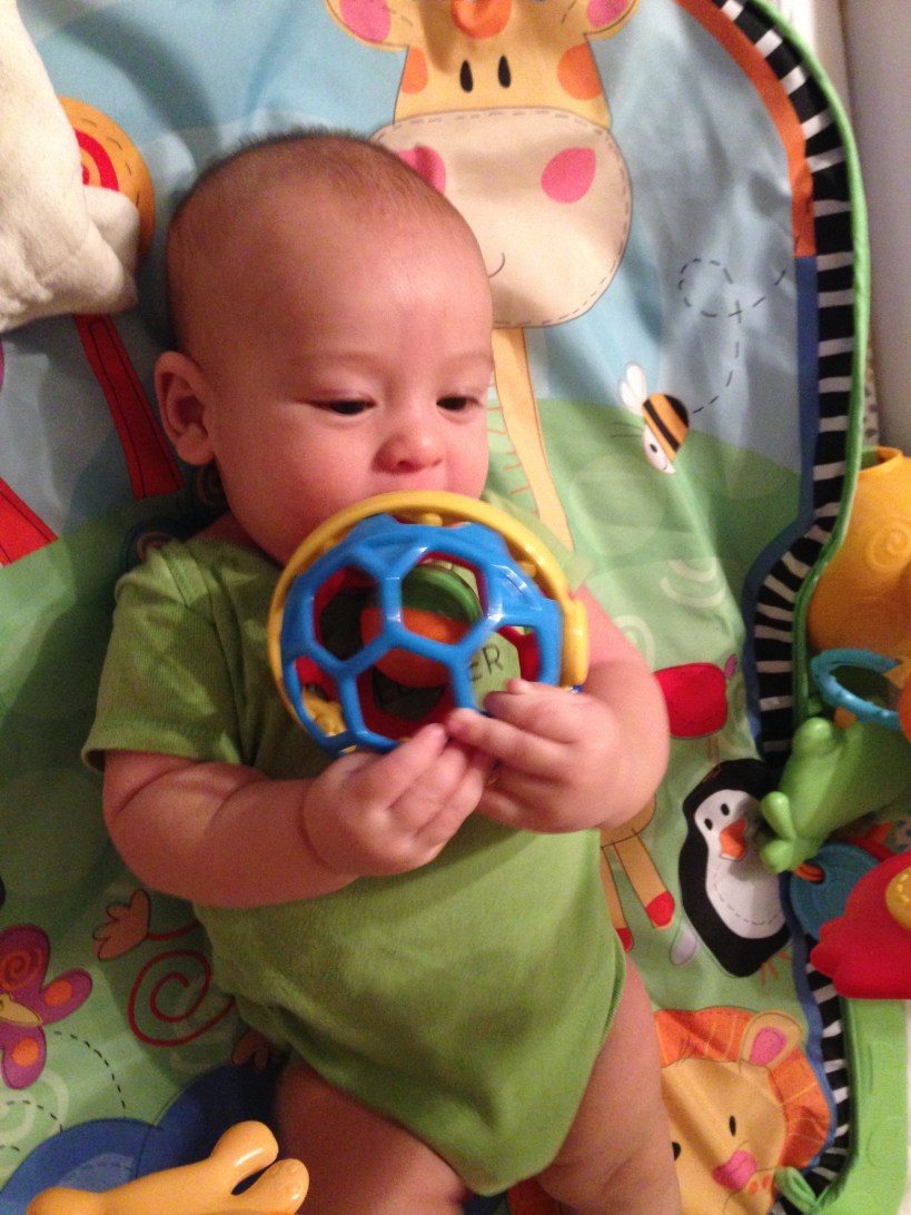 Sept 25 (14 wks) – A new toy for his 14th week anniversary. He liked it until Sophie the Giraffe came.