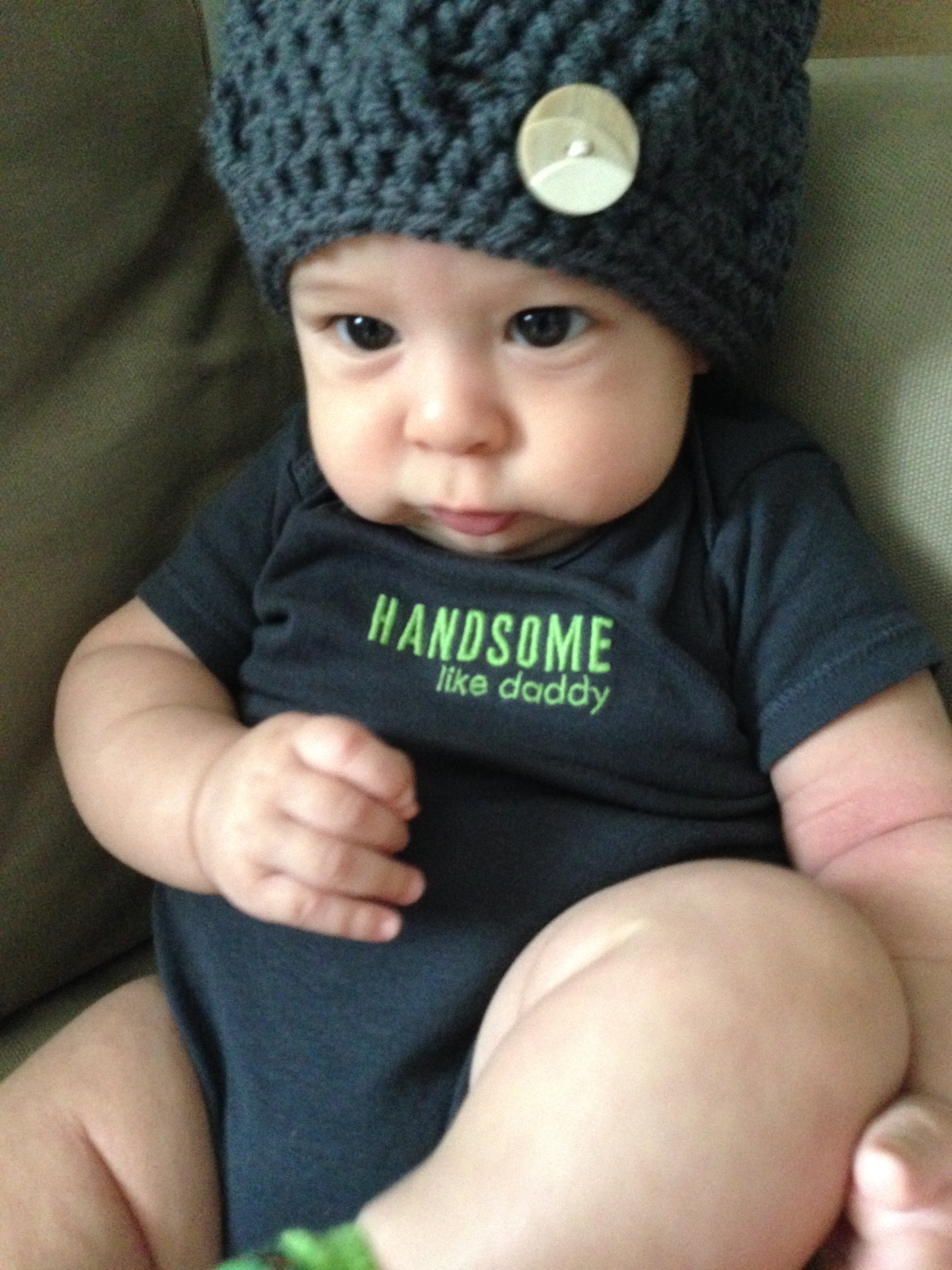 Sept 26 (14 w 1 d) – Doesn’t Eli look totes adorbs in this beanie that Erin and Justin got for him? It’s still big, but might be perfect by the time winter comes ’round!