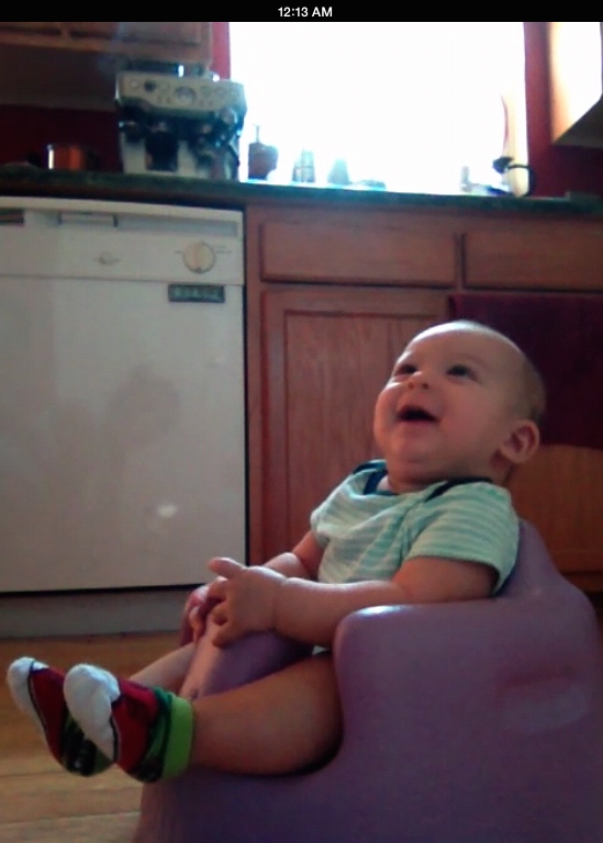 Sept 27 (14 w 2 d) – Daddy found this Bumbo seat for $5 at a yard sale! He doesn’t mind sitting in it as long as it’s not for too long! This is the perfect chair for Mommy to trim Eli’s fingernails!