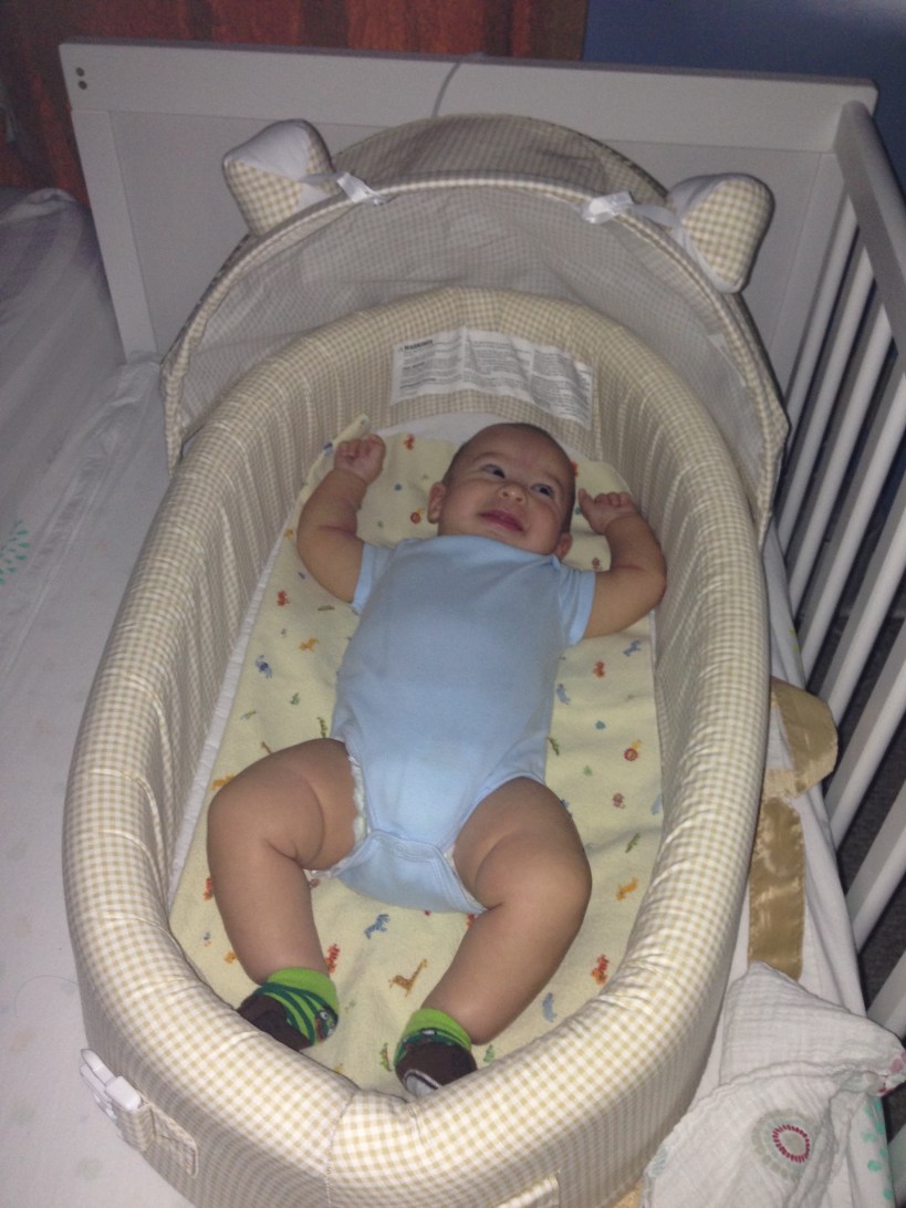 Oct 3 (15 w 1 d) – Seriously, Eli is in a good mood as soon as he gets up! (Lucky me!) He had JUST woken up from his nap, and I snapped this shot (with flash) to show how he is outgrowing his bassinet. Very sad!