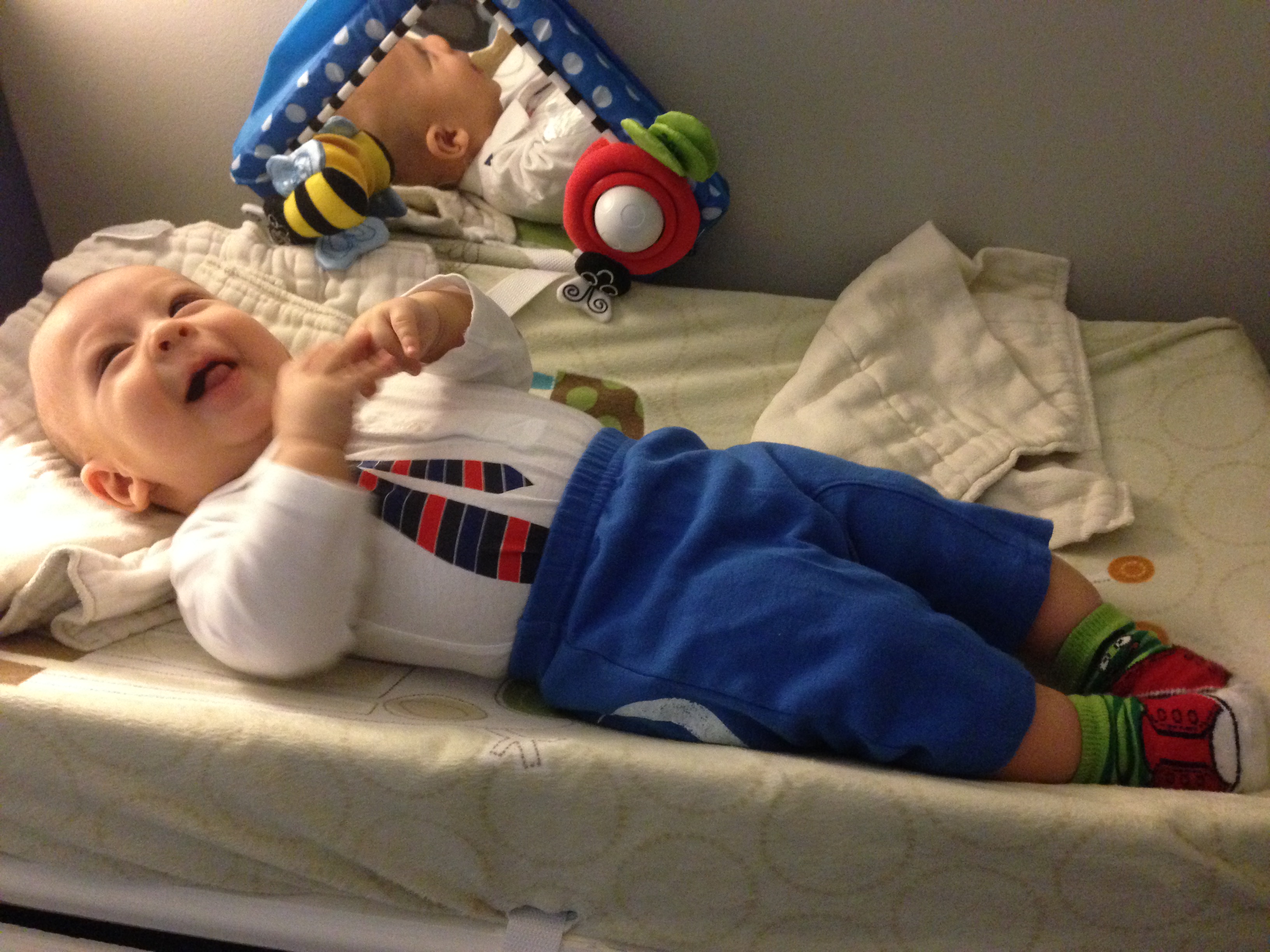 Oct 5 (15 w 3 d) – I think Eli approves this outfit. He looks like a Vietnamese student (their uniforms are this color)!