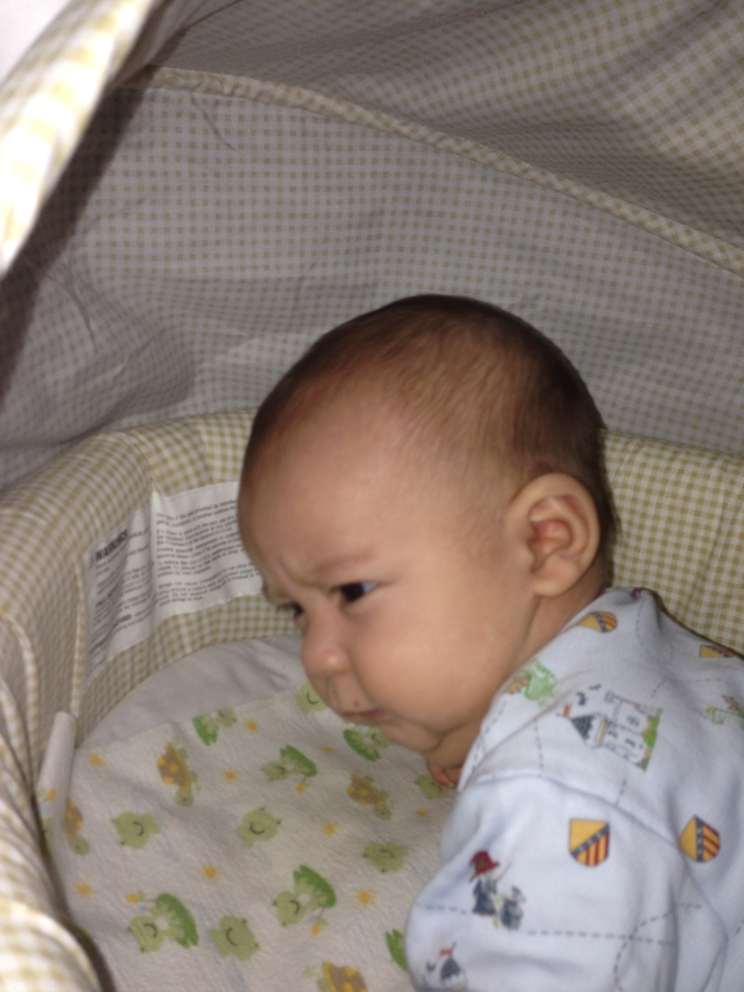Oct 7 (15 w 5 d) – After many attempts to put him to sleep (yes, he sleeps on his tummy even though I know I’m not supposed to. It’s the only way I can get him to sleep), he pushed himself up, whipped his head around, and flashed a toothless grin as if to say, “Hee hee, Mom, nice try. You thought you’d get me to sleep that easily?” The frown was because of the very bright camera flash!