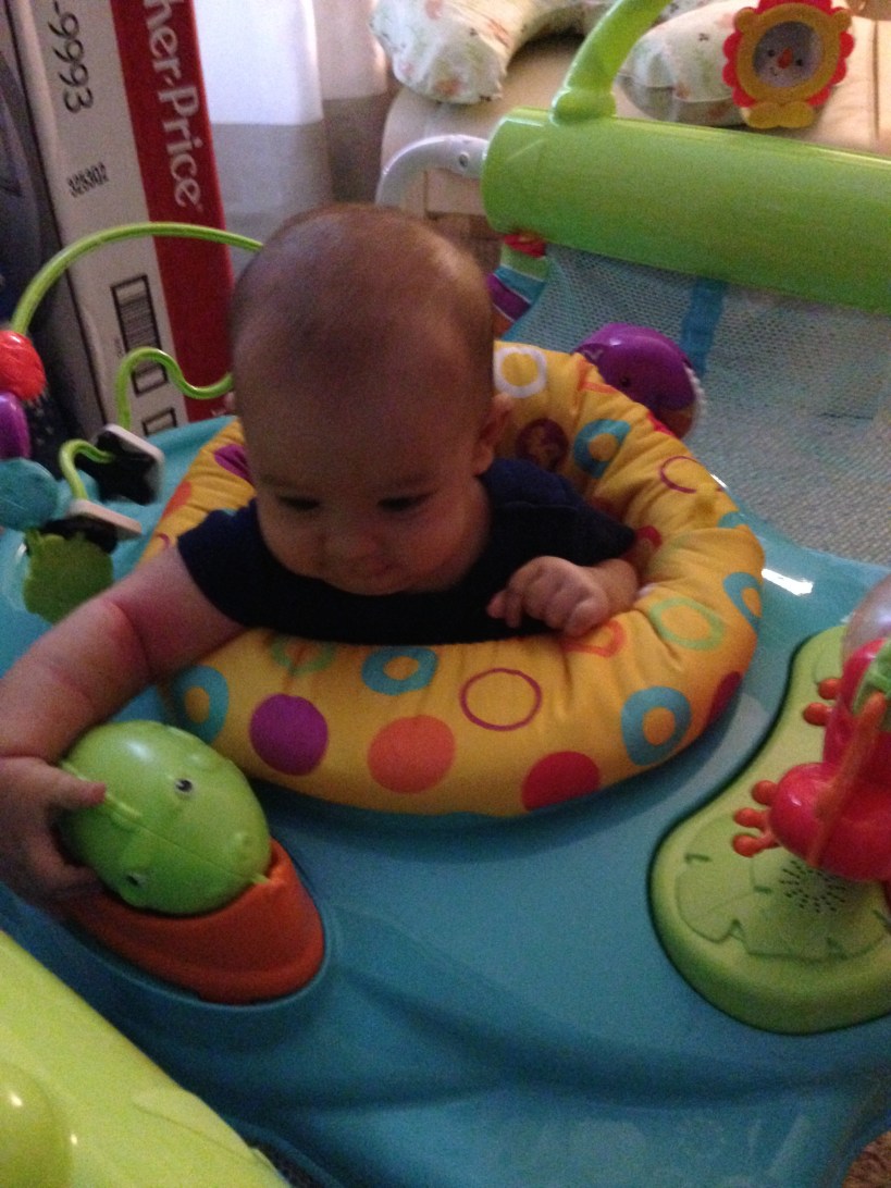 Oct 9 (16 wks) – Starting to show interest in his bouncer/walker. His feet still don’t touch the ground though, so it’s so cute to watch him dangle for a little bit!