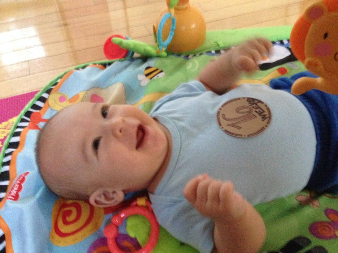 Oct 9 (16 wks) – He laughs at farting/squishing noises, the /v/ sound, as well as the /th/ sound being sucked in. He also loves the whale sneezing song (Thai) I learned as a kid.