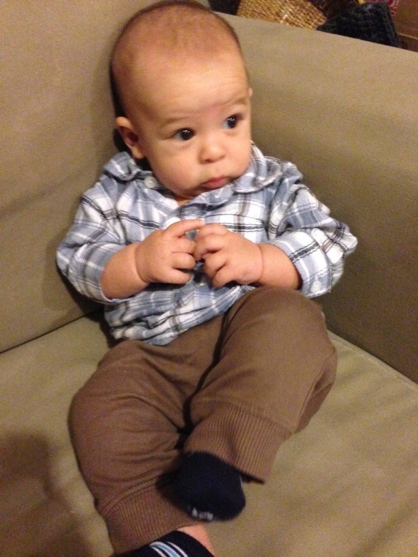 Oct 12 (16 w 3 d) – To commemorate Eli’s most adult-like outfit, he is sitting in his pensive pose.