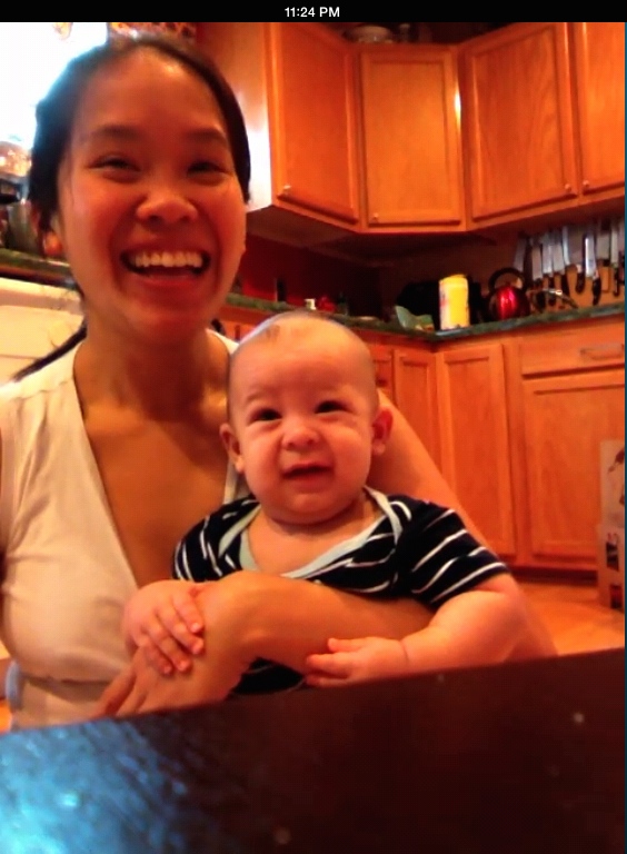 Oct 17 (17 w 1 d) – We (Grandma and I) noticed that Eli was trying out a new smile. In Thai, it’s called “ยิ้มแหยๆ” but there’s no approximation for it in English. Dry smile? Regardless, it’s hilarious, and Grandma captured it on Skype!