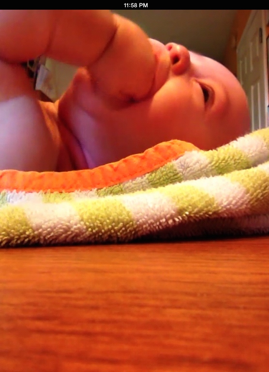 Oct 17 (17 w 1 d) – No, seriously, like my fist tastes AMAZING! This picture was taken through Skype on Grandma’s iPad in Bangkok while Mom was dressing me after my bath. Talk about convoluted!! 🙂