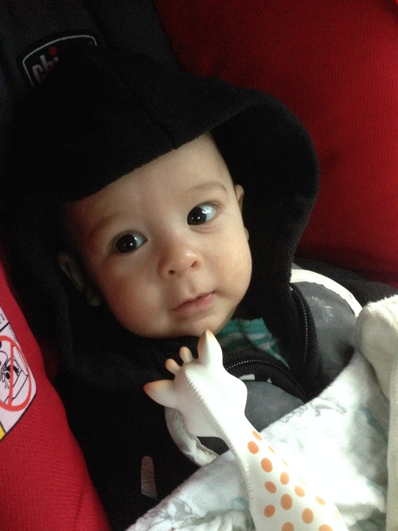 Oct 18 (17 w 2 d) – Trusty Sophie accompanies him on almost all trips!