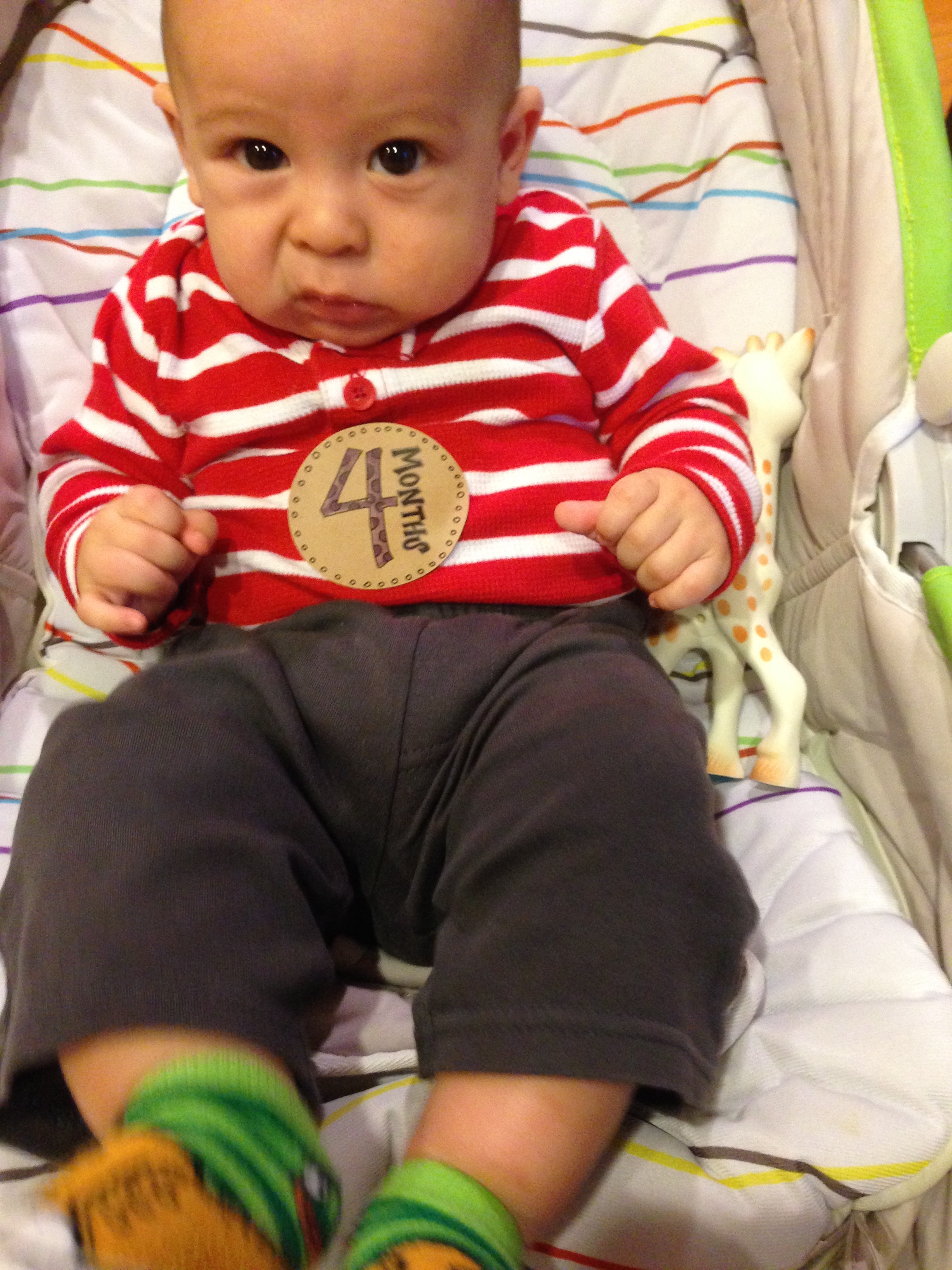 Oct 19 (4m) – Here! How’s this for a pose? Grrrr…(actually, Eli was trying to shift himself in the seat and grunting in the effort!)