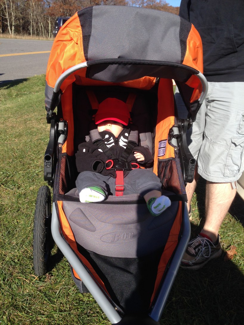Oct 25 (4m6d) – A warmer walk on Big Meadows (the warmest one so far). Dad tried using the jogger without the carseat attachment. It worked okay, but I hated not being able to see you, so you’ve been in the carseat again. I suspect I’ll keep using the carseat until you outgrow it (30 pounds is the limit, and at your four-month appointment, you were 15.9 pounds! Over halfway there!)