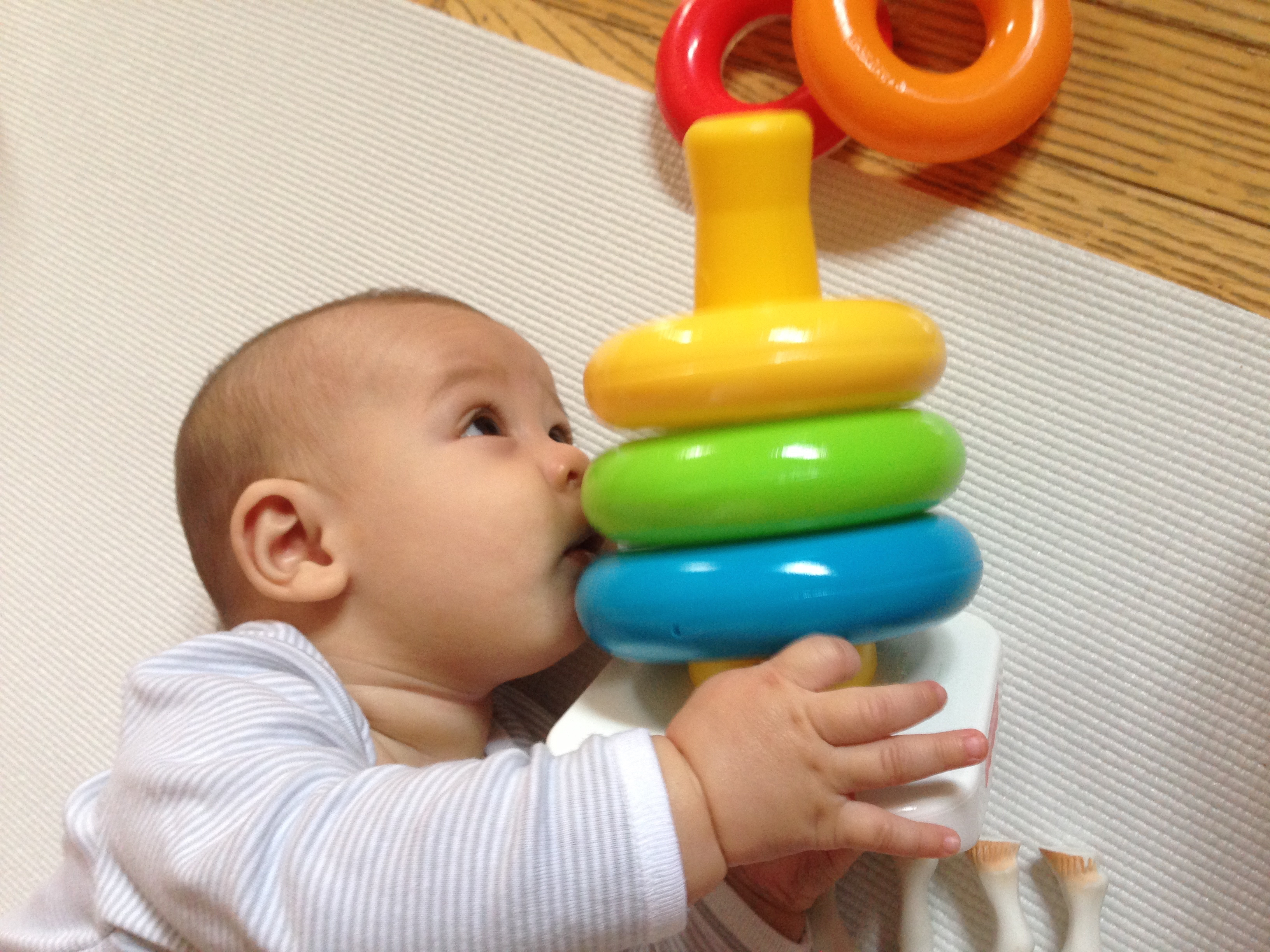 Oct 31 (4m12d) – You’re at the age where everything goes in your mouth. Hmm…what’s this toy? Dunno … let’s taste it and see if we can find out!
