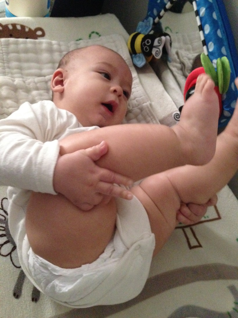 Nov 14 (21 weeks) – Since yesterday, I noticed that you were trying to get your feet in your hands and pull them towards your mouth! I snapped this picture before we headed out for a (cold) run at Riverview. Later that night, while you were chilling out in the swing and reaching for your foot again, you pulled off your sock and put THAT in your mouth instead! We Skyped with Ông and Bà before bed and you finally succeeded in putting your foot in your mouth! That’s the only evidence I have of this momentous occasion! No photographic proof!!