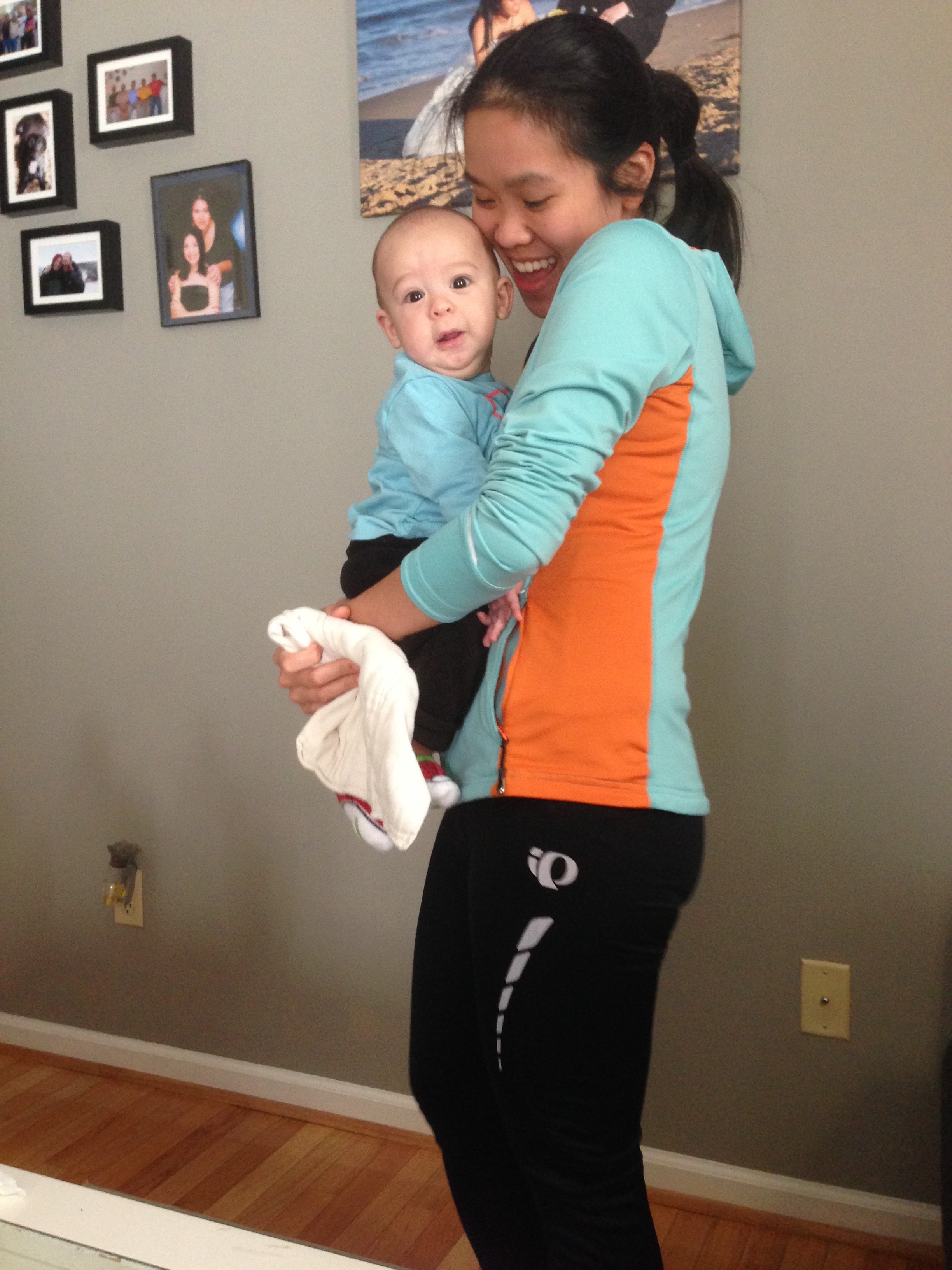 Nov 18 (4m30d) – Just one day shy of your 5th month! Before our COLD run to the downtown mall, I noticed that you and I were dress in identical colors, so we had to have Dad take a snapshot! I had just woken you up from a nice, long nap, but you were still smiling! 🙂