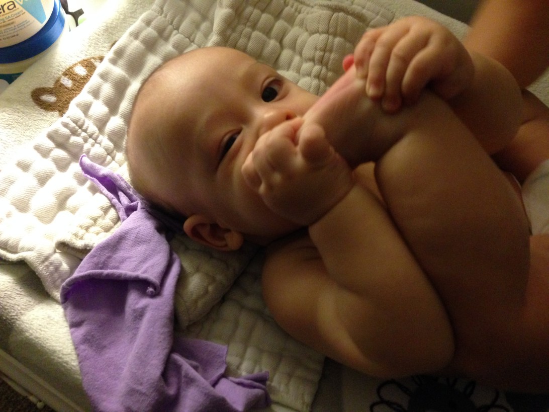 Nov 25 (5m6d) – Often, it takes a bit of work to get your foot near your mouth, so when it finally gets near, you shove it right in your mouth! With such force that your right eye gets all squished up!