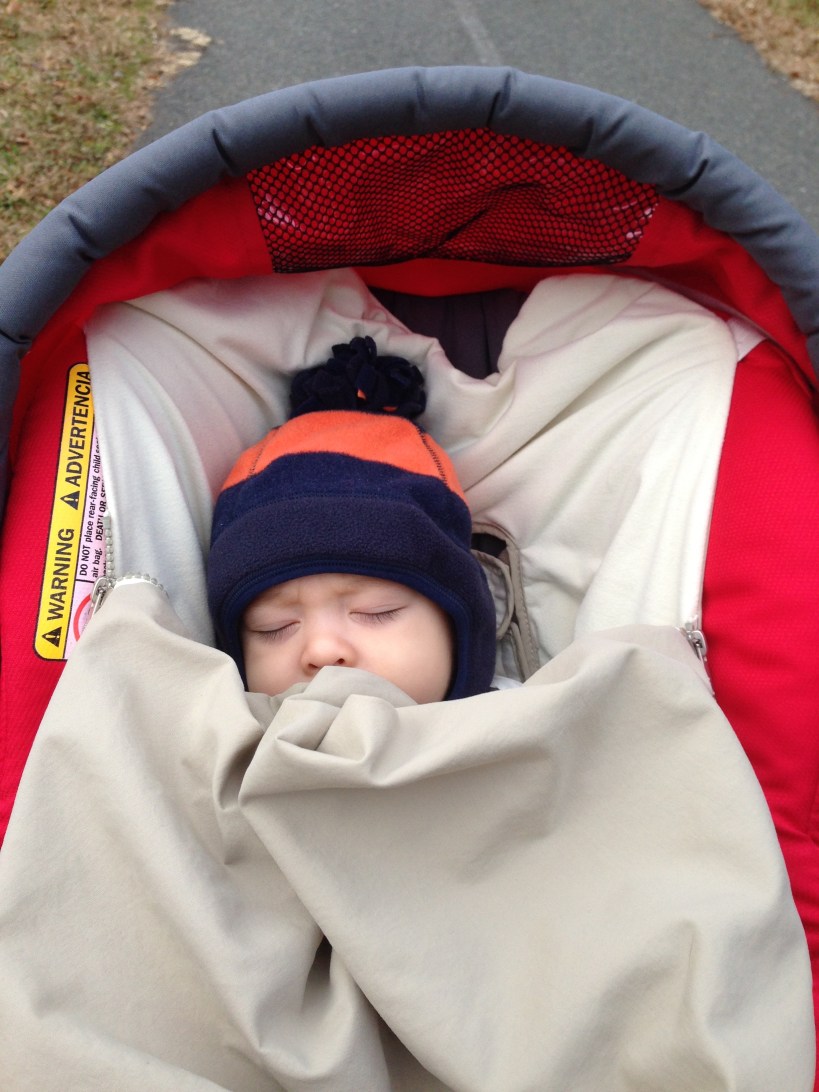 Nov 29 (5m10d) – I usually try to take you out on our runs after you wake up from your naps and before you fall asleep again. Sometimes, things don’t go according to plan, and you end up just falling asleep during the run. Rather than wake you up by moving you into the car (I’ve never successfully transferred you from stroller to car without waking you up), I just keep walking round and round until you wake up! I’m sure Ms. Riley doesn’t mind!