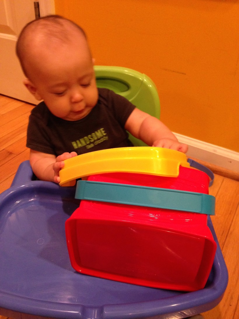 Nov 30 (5m11d) – I put you back in this seat successfully. The last time I put you in here (maybe at three months?), you burst into tears because you didn’t like the tray snapping in and holding you in place. That’s my guess, anyway. I mean, you also once burst into tears when I showed you a picture of pants with ruffles on the butt. Perhaps a budding fashionista as well? Here, you are inspecting what’s inside this toy box…