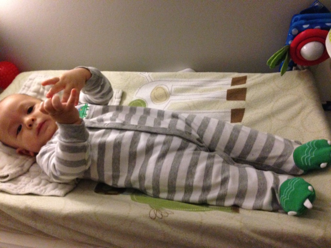 Dec 5 (5m16d) – Here you are modeling your very own 9-month-sized stegosaurus (I think) pajamas. The feet even have little claws, but you seem more interested in your own paws!!