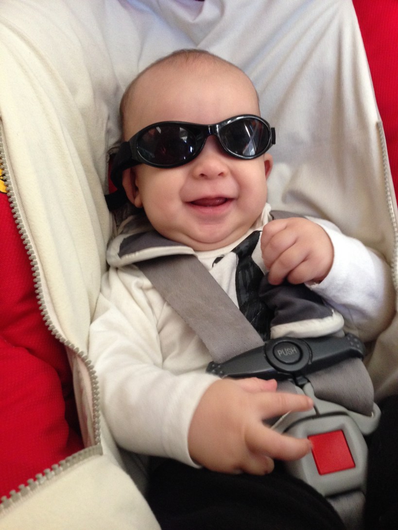 Dec 7 (5m18d) – Haha! It’s so funny that you think I’ll actually keep it on. You know I’m going to try to eat the straps when you place me in the car — even if that means I have to stare at the sun!