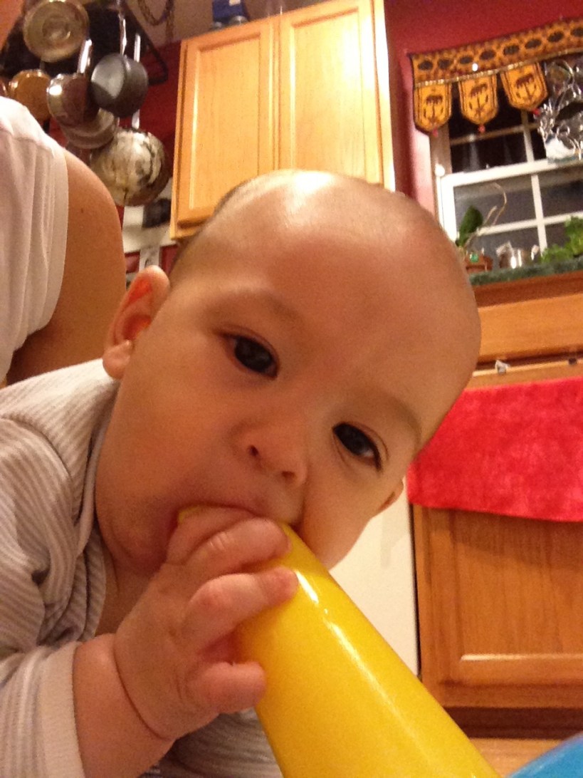 Dec 15 (5m26d) – You love playing with the Fisher-Price ring stacking toy, but I’m not sure if you like the hoops or the tower more. From this picture, I would venture to guess that you like the tower more.