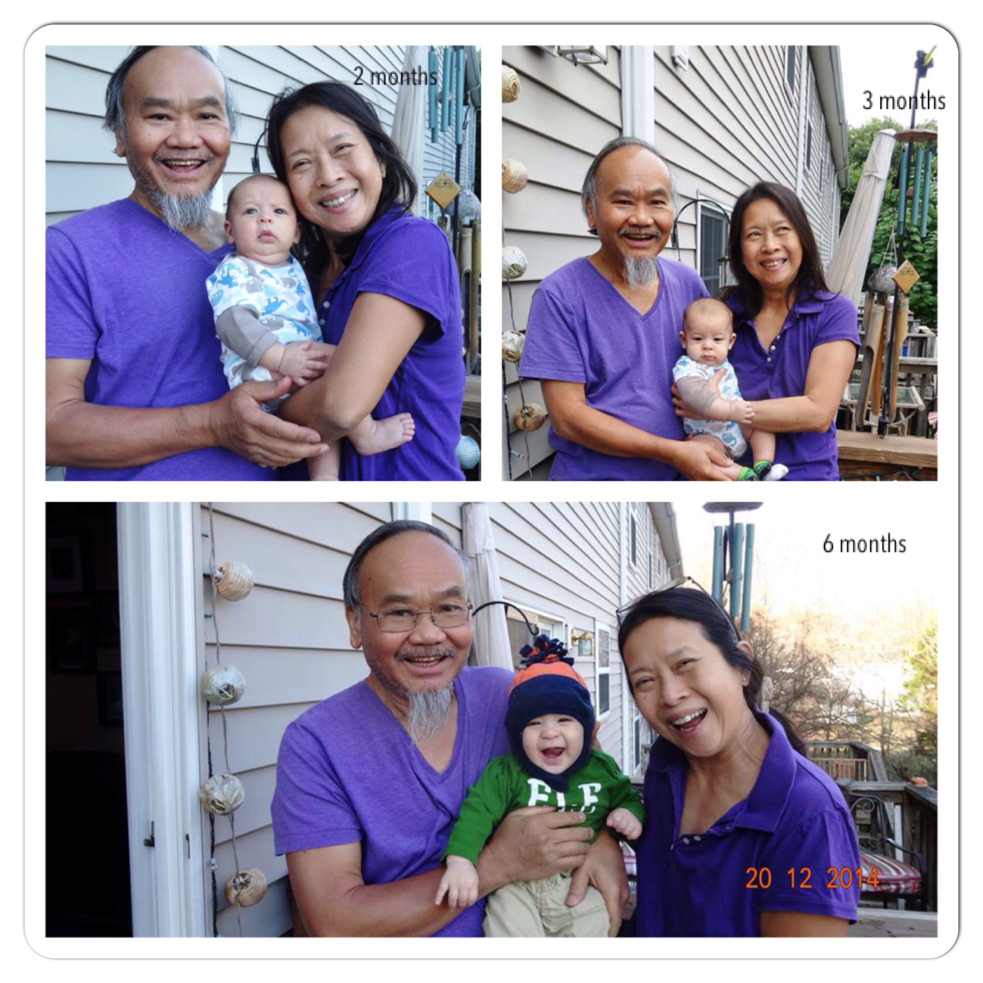 Dec 19 (6m) – Are you sensing a theme here? You should know that the 6-month picture was taken in the winter when it was very cold (hence your hat!!). It was too cold to be wearing purple short-sleeved shirts, but anything for a good picture! 😀