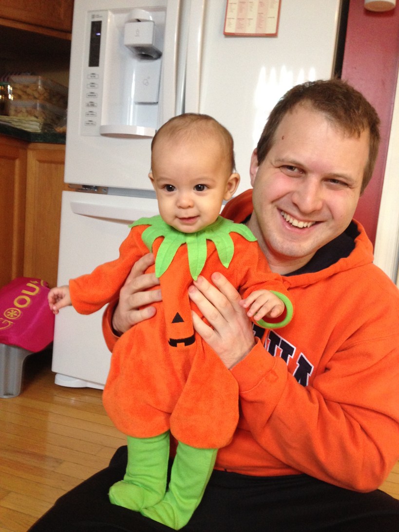 Dec 23 (6m4d) – That day, there was a gas leak on the road outside of our neighborhood, so the water was shut off! Instead of getting to take a bath, you stayed in this costume, and we got to have even more fun with our little pumpkin!