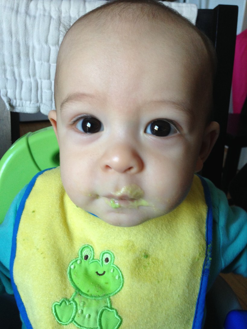 Jan 9 (6m21d) – Yum … potatoes, egg yolk, and peas!
