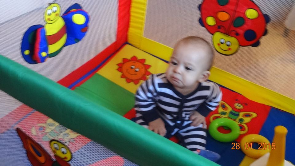 Jan 28 (7m9d) – Ông and Bà bought you this awesome play yard with toys built in to the sides! Despite your face, you LOVE playing in here. You had just whacked your head on the ring toys and were about to cry. You have the cutest sad face, but I’m grateful that it’s pretty rare and lasts only a moment.