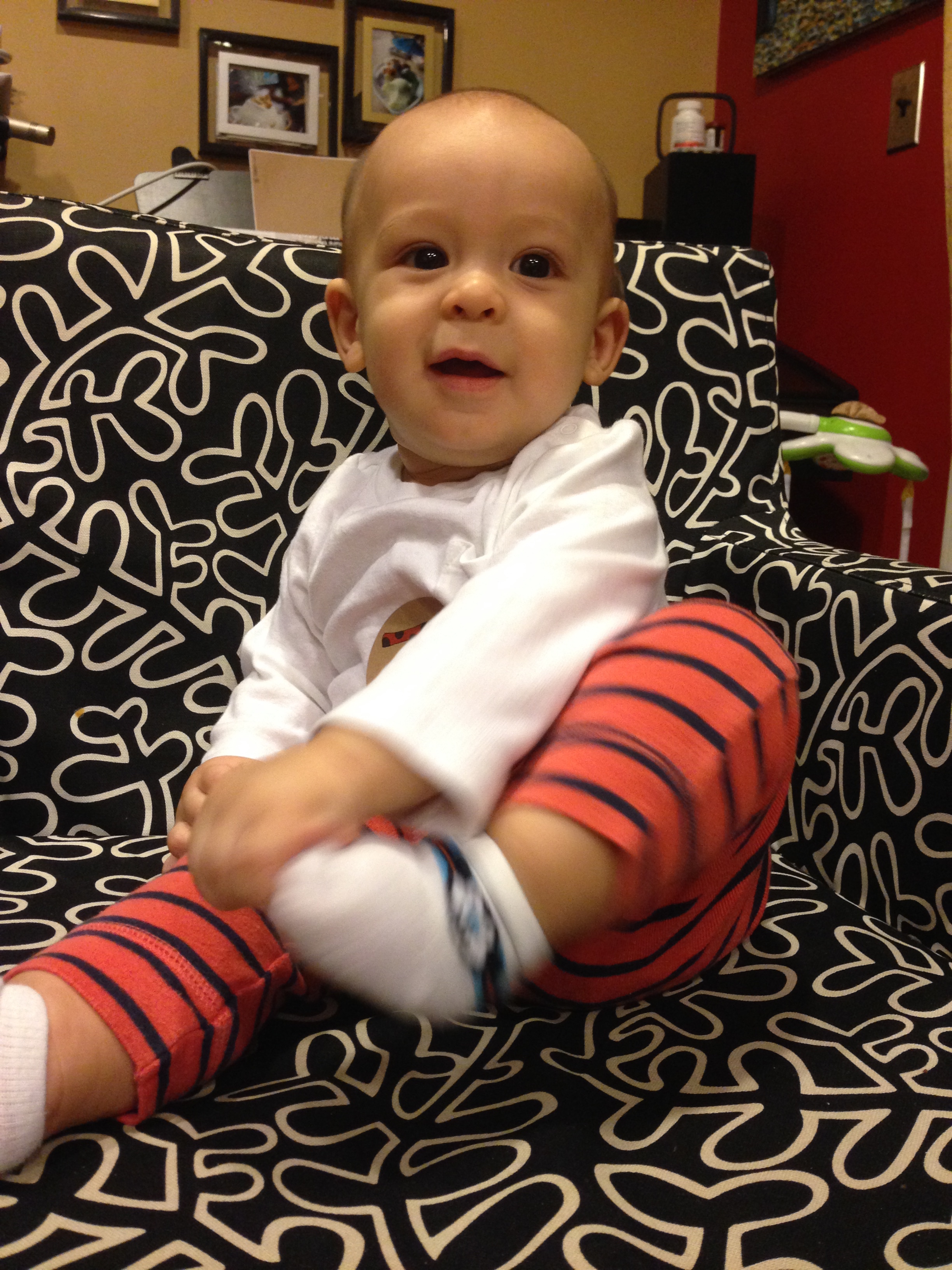 Jan 19 (7m) – I didn’t (couldn’t) take your picture on the usual white yoga mat because you were so active tonight! You were rolling over, crawling, and just generally moving. So, the chair it was!