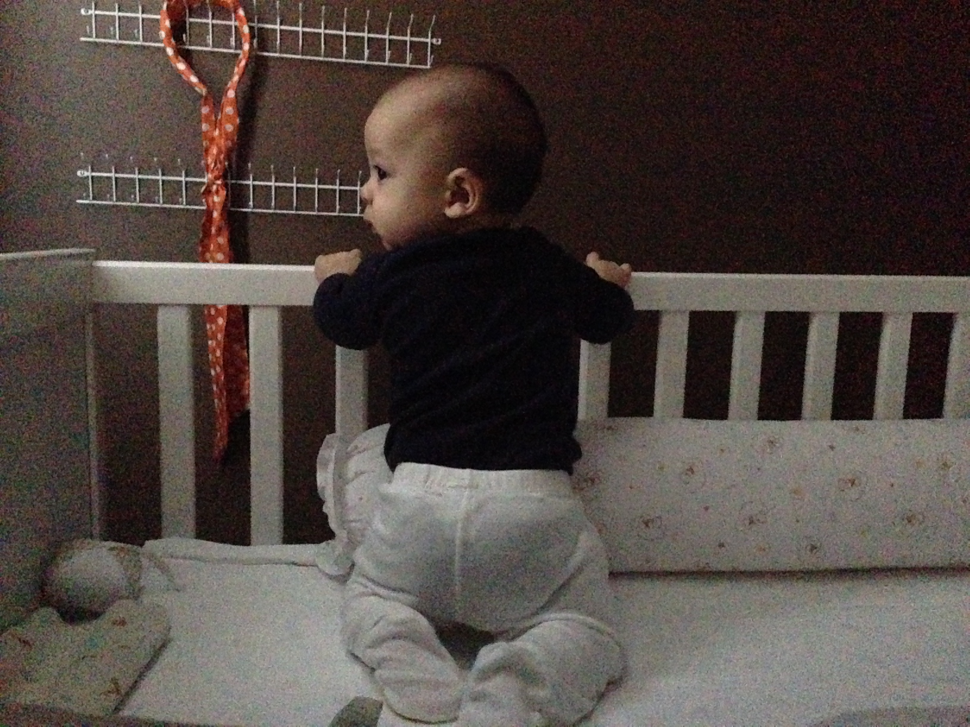 Jan 21 (7m2d) – So here’s a picture of you pulling yourself up to your knees in your crib. The mattress was still up at the higher setting at this point. I started getting really nervous because you were beginning to come up on your feet and that railing was NOT going to hold you in! (You succeeded on getting to your feet once, but thankfully, I was nearby to hold you from toppling over!) That night, your dad and Ông lowered your mattress and put the fourth side back in. You didn’t seem to mind one bit! (Mommy made have had a tinge of sadness that she couldn’t just reach over and touch you at night!)