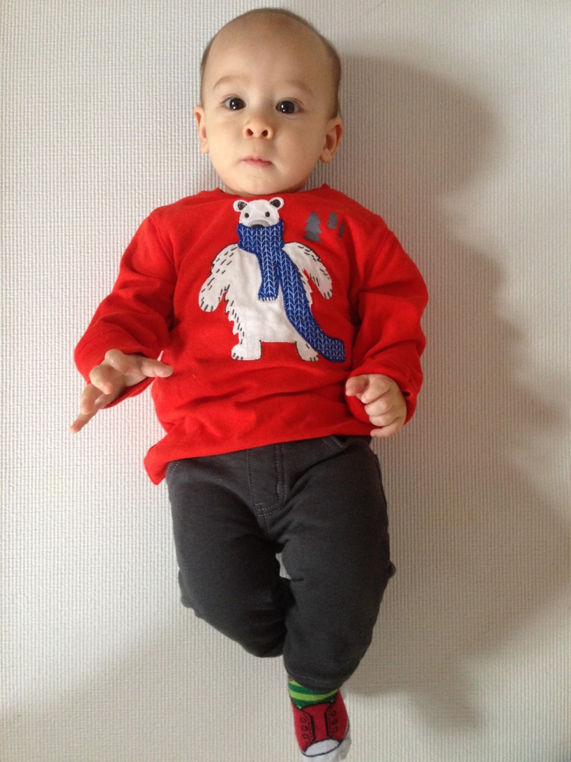 Jan 22 (33wks) – Where’s your smile? It was getting past your naptime, and tI think you’d finally had enough of pictures! But you look so darling in this outfit from Uncle Quang and Aunt Ginnie!