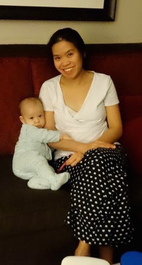 Jan 31 (7m12d) – This was the morning that Ông and Bà were leaving. It was your first stay in a hotel (Embassy Suites in Sterling, VA). Look at you hugging my arm! So cute!