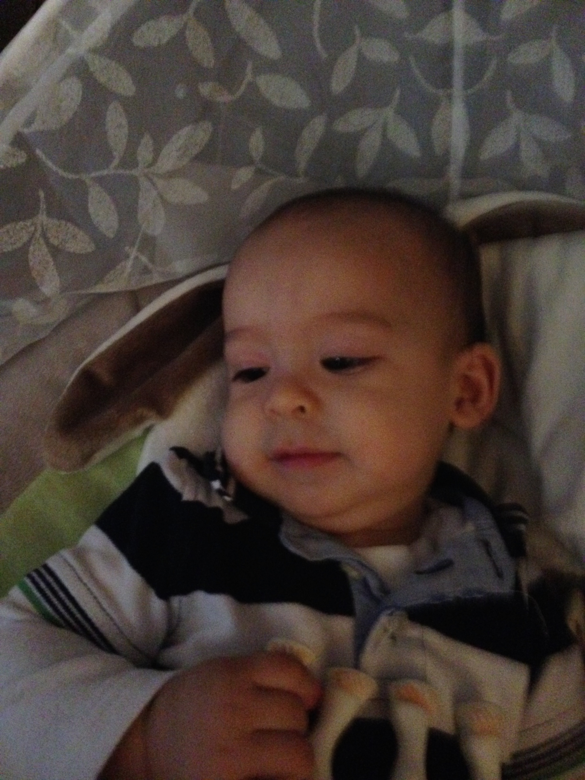 Feb 13 (7m25d) – I still place you in your swing even though half your calves stick out of it. Why? Because you get all giggly and excited! The other day, I was in the other room when I heard a strange clicking sound from the swing. Turns out you had reached up to pull at the mobile overhead, preventing it from turning! You were very proud of yourself.