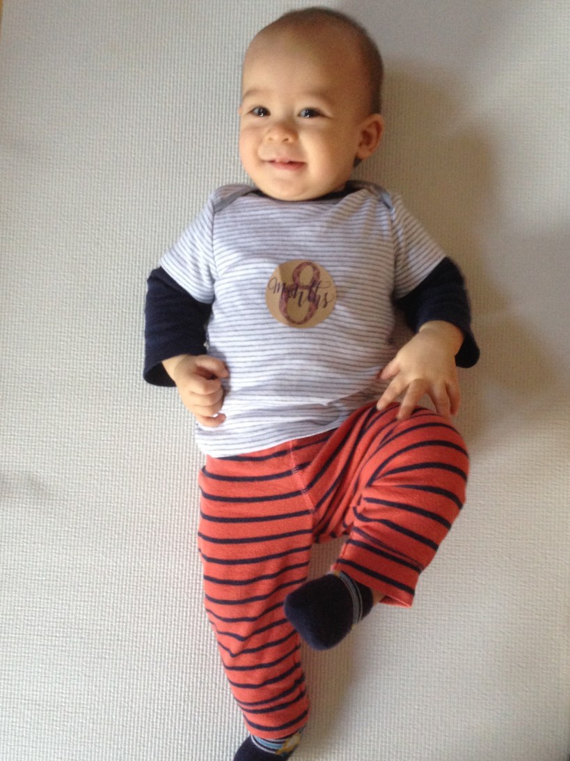 Feb 19 (8 m) – Cutie pie! It’s getting so difficult to snap these pictures of you because you immediately want to roll over and crawl away!