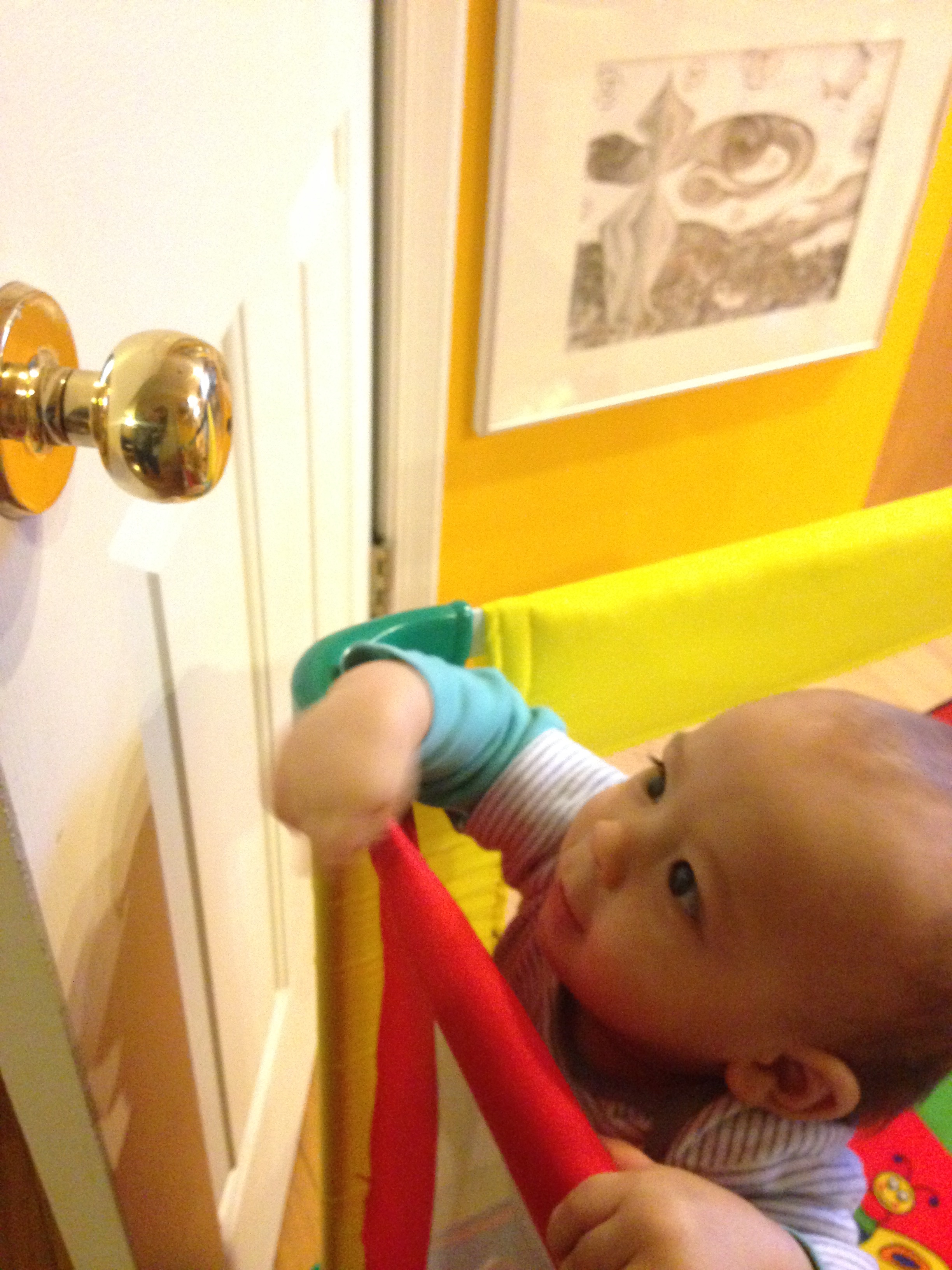 Feb 26 (8m1w) – You started noticing the doorknob from your playpen (in which you can now easily pull yourself up into standing position)!