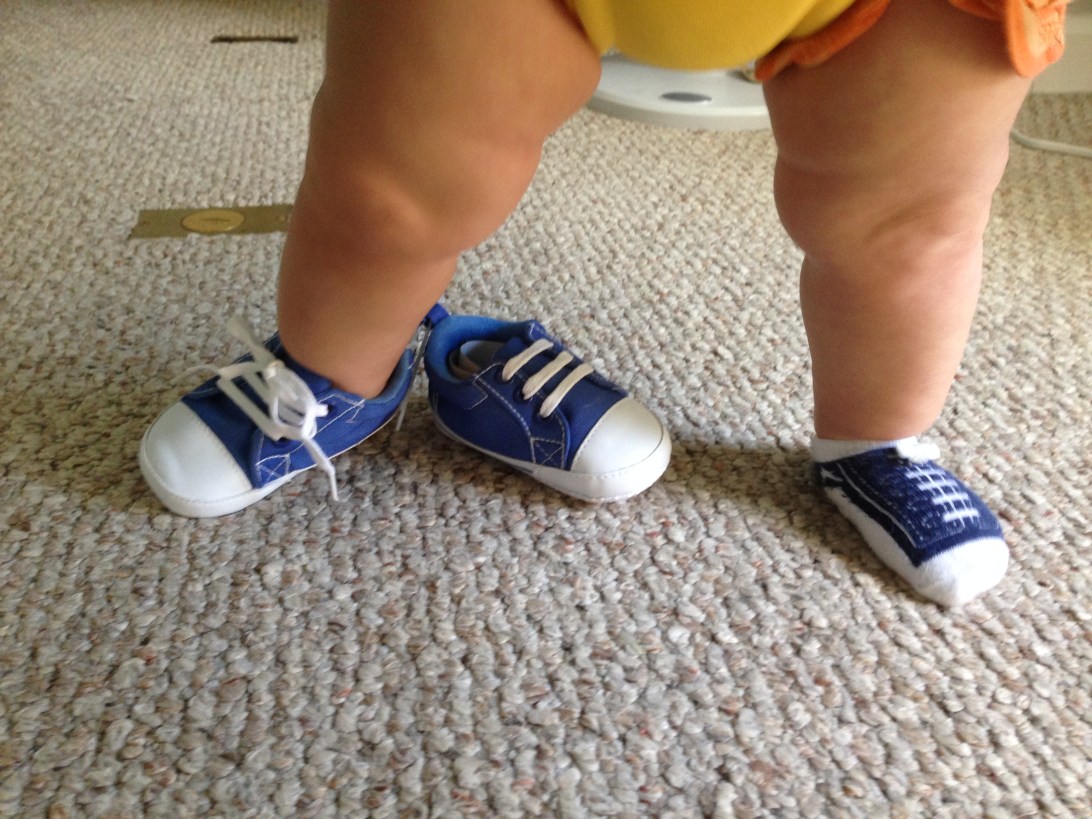 Mar 16 (8m25d) – Look at your cute legs (taken from the bouncer). You have new shoes! (Socks on one foot, new shoes on the other … similar color!)