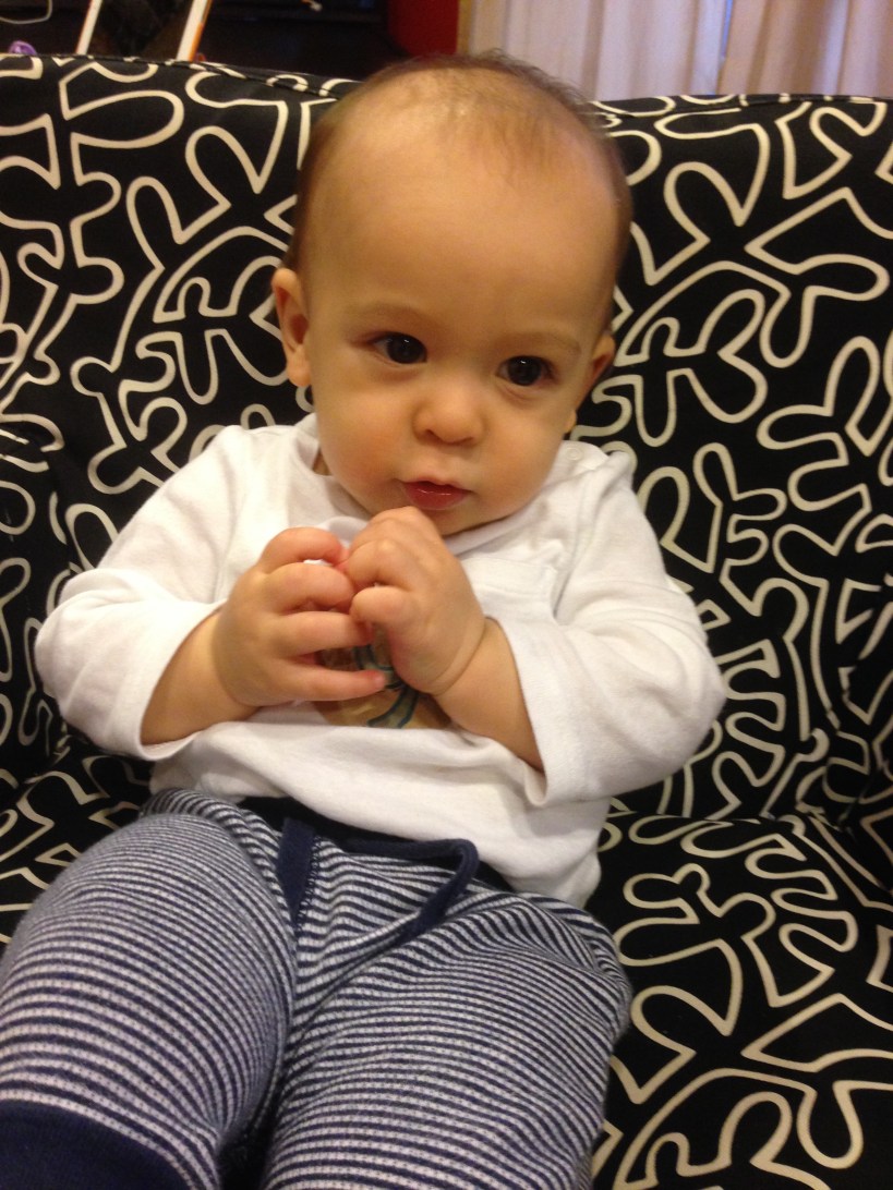 Mar 19 (9 months) – You were guarding your beloved 9-month sticker (from me) because you surely wanted to suck on it!