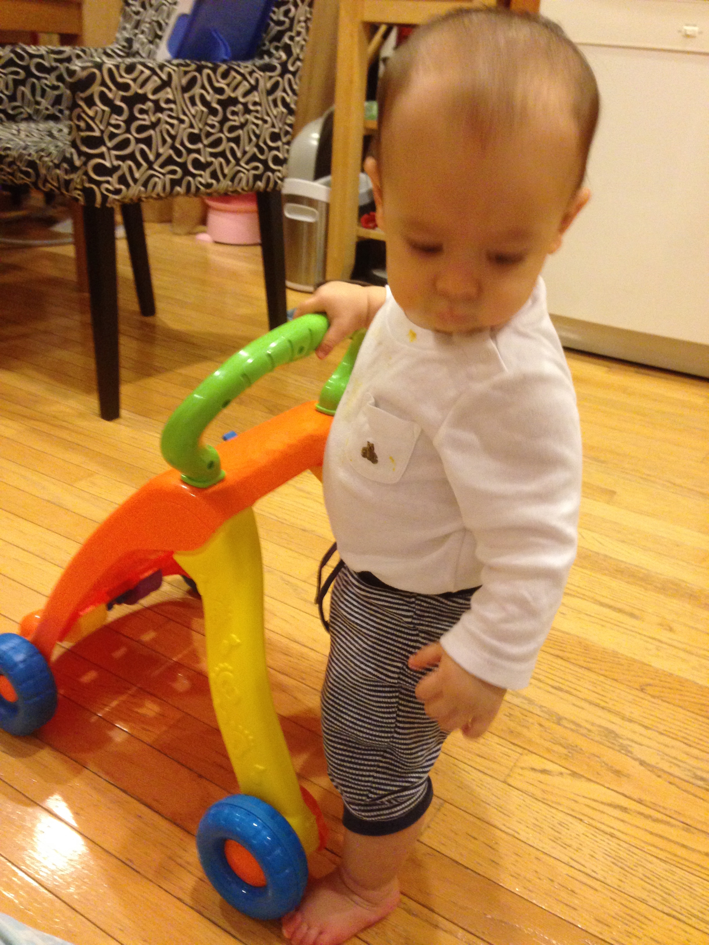 Mar 19 (9 months) – Sometimes, you one-handedly push your walker back and forth as though you’re vacuuming the floor!