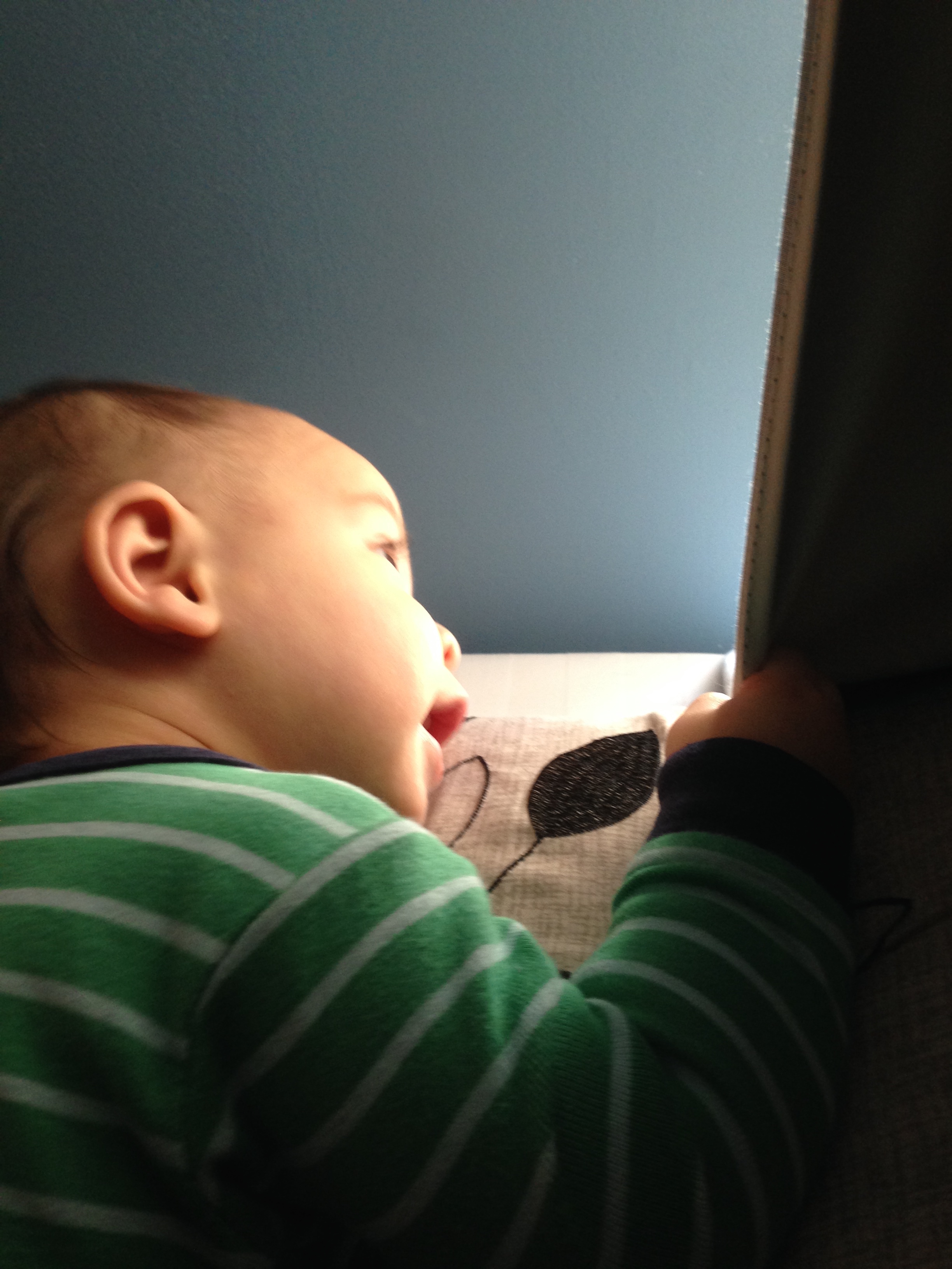 Apr 4 (9m15d) – You love to look out the window! Here you are peeking out through the curtains and blinds, enjoying the morning sun.