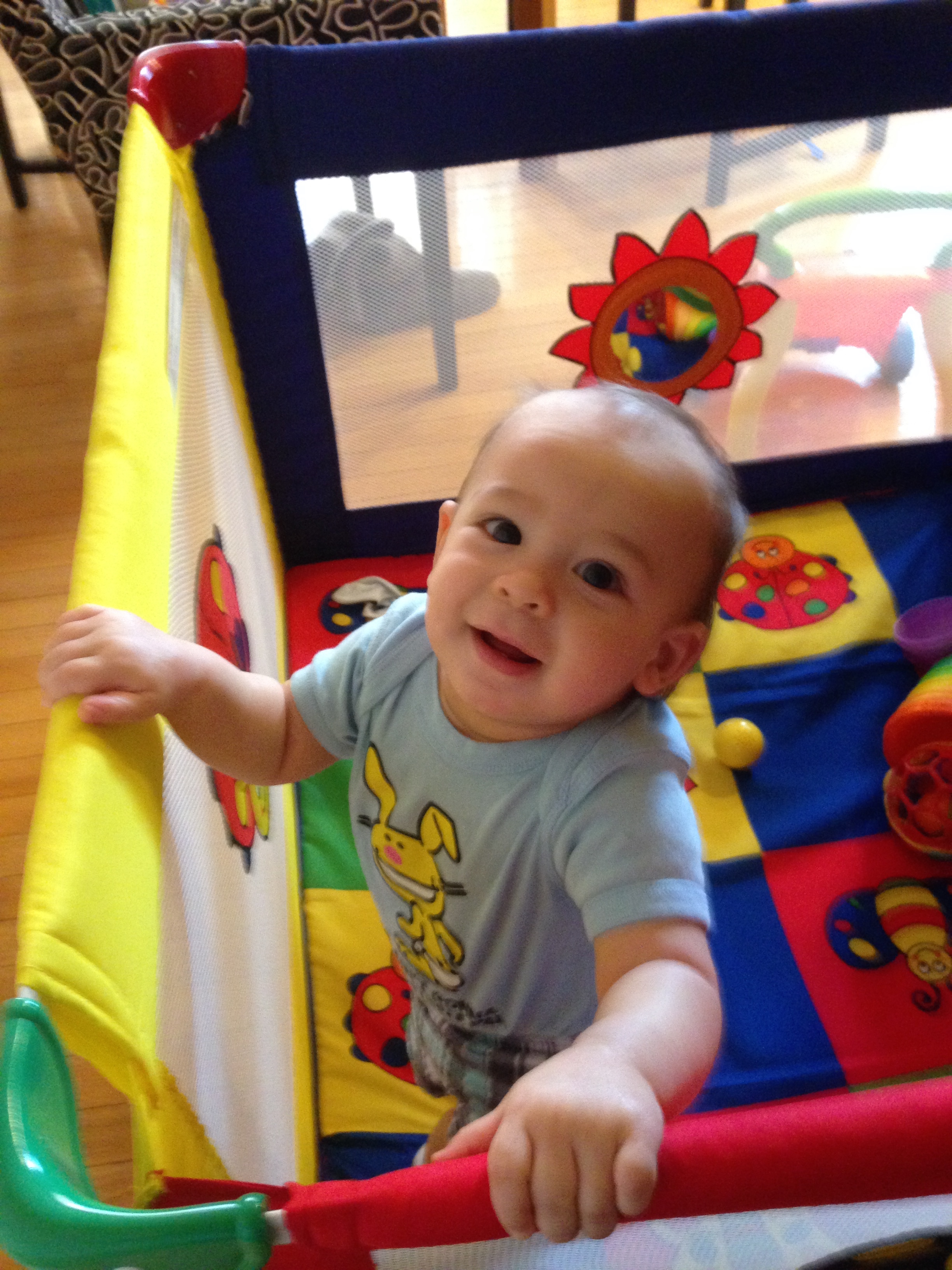 Apr 7 (9m18d) – You used to have such a hard time pulling yourself up to standing in the play yard. Now you can pretty much reach the bathroom doorknob without having to tiptoe!