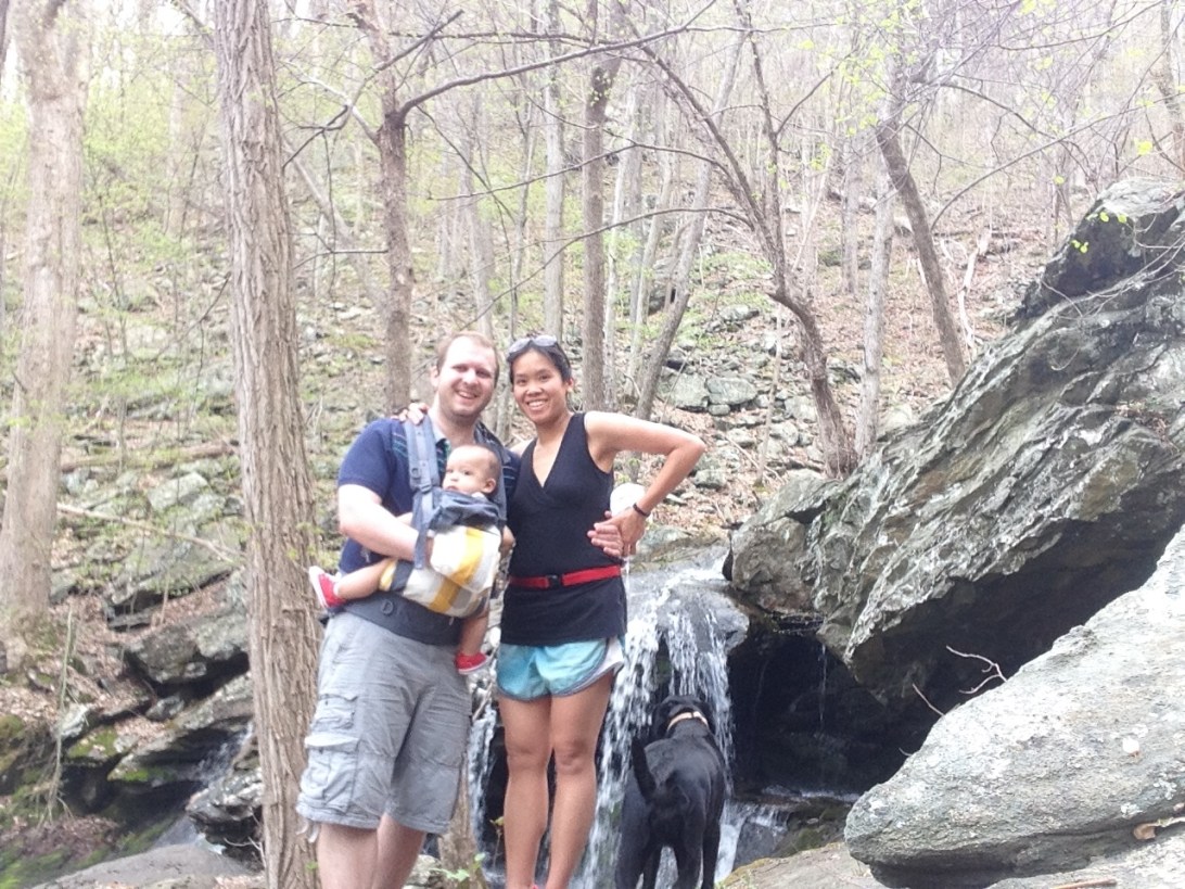 Apr 18 (9m29d) – A family picture at the waterfall (but where’s the waterfall?!). Your dad and I were just how perfect this picture was (even YOU were looking at the phone), when we noticed Riley’s … butt! We forgot to tell her to look, too! π P.S. the waterfall was much bigger than that cascade you see behind us.