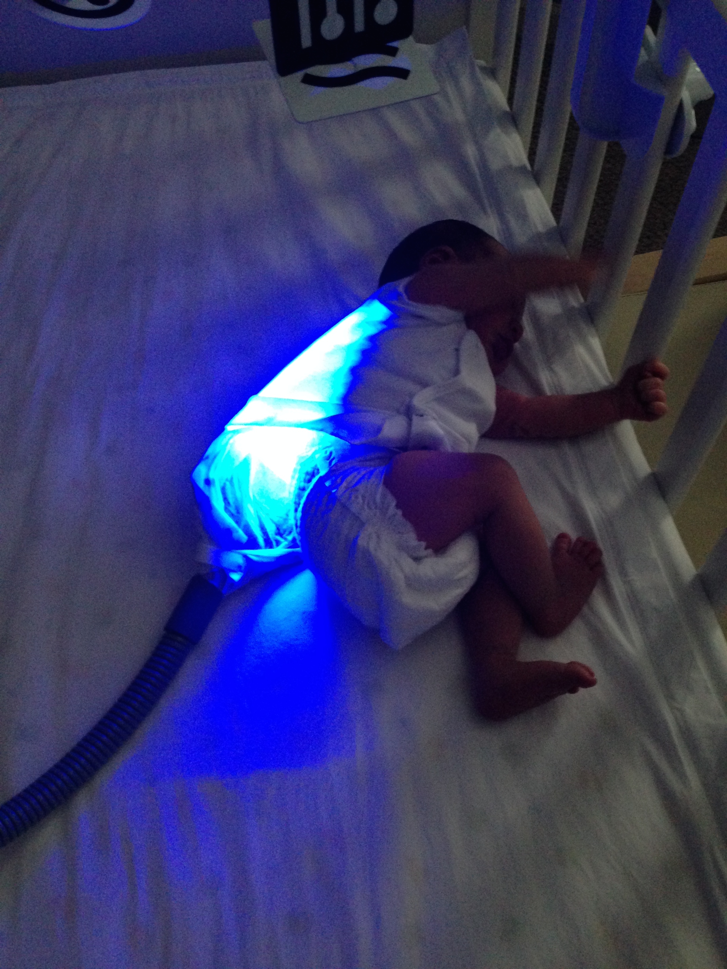 5 days old — after our first pediatrician visit (where I dissolved into a sobbing mess in the corner), Eli’s bilirubin was elevated, so he got this bili blanket. He looks like a superhero!